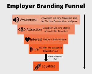 Identifizieren Sie nicht nur Ihre Zielgruppe, sondern auch Stärken und Schwächen. Sammeln Sie Ihre Benefits, gestalten und tragen Sie diese auf dem passenden Weg an Ihre zukünftigen Mitarbeiter heran. Das Werbewirksamkeitsprinzip AIDA lässt sich auf die Bewerbersuche ummünzen und erweitern. Kreieren Sie eine Strategie, die Aufmerksamkeit schafft (Awareness). Formen Sie Ihre eigene Marke und wecken Sie damit Interesse (Interest), dieses soll zur Interaktion mit Ihnen führen (Desire) und schlussendlich zum Einstellungsprozess (Action). Abschließend ist das Ziel, eine nachhaltige Verbindung zu erzeugen (Loyalität).