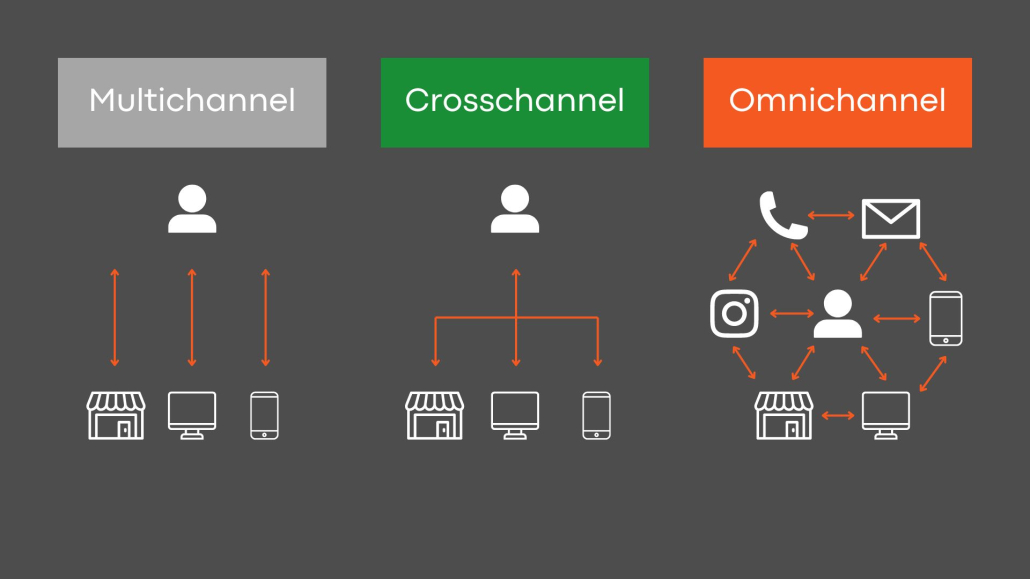 Beim Omnichannel sind Multichannel und Crosschannel naheliegend, dabei unterscheiden sie sich grundlegend voneinander. Beim Multichannel-Marketing werden Produkte über mehr als einen Vertriebskanal verkauft, es besteht aber keine Verknüpfung zwischen den verschiedenen Kanälen. Dies gilt inzwischen allerdings als überholt, weswegen das Konzept weiterentwickelt wurde. Eine erste Verzahnung der Vertriebskanäle findet beim Crosschannel-Marketing statt. Ein klassisches Beispiel hierfür ist, wenn ein Kunde etwas im Onlineshop bestellt und im Ladengeschäft abholt. Bereits hier kann der Kunde zwischen den Kanälen wechseln. Omnichannel ist wiederum eine Weiterführung, bei der anstelle des Produkts der Kunde im Mittelpunkt steht und nicht mehr zwischen den Kanälen gewechselt wird, sondern diese simultan genutzt werden. Dabei werden sowohl die Vertriebskanäle als auch die Kommunikationskanäle miteinander vernetzt, um die Kundenansprache zu verbessern und die dazugehörigen Daten über alle Kanäle hinweg nutzen zu können.
