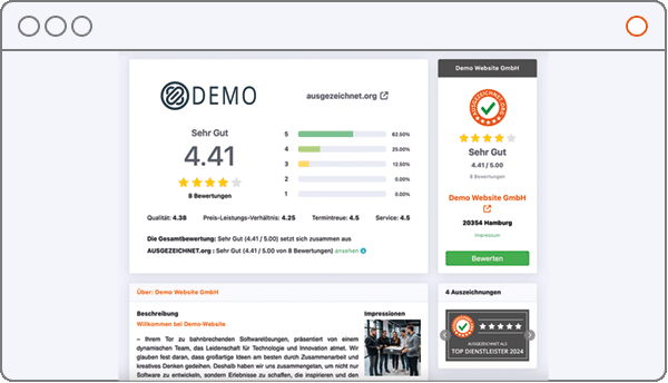 Nach erfolgreicher Registrierung erhalten Sie bei uns Ihr persönliches Bewertungsprofil, welches über einen Klick auf das Bewertungssiegel erreichbar ist. Das Bewertungsprofil gibt Nutzern einen Überblick, wie gut Ihr Unternehmen bewertet ist.