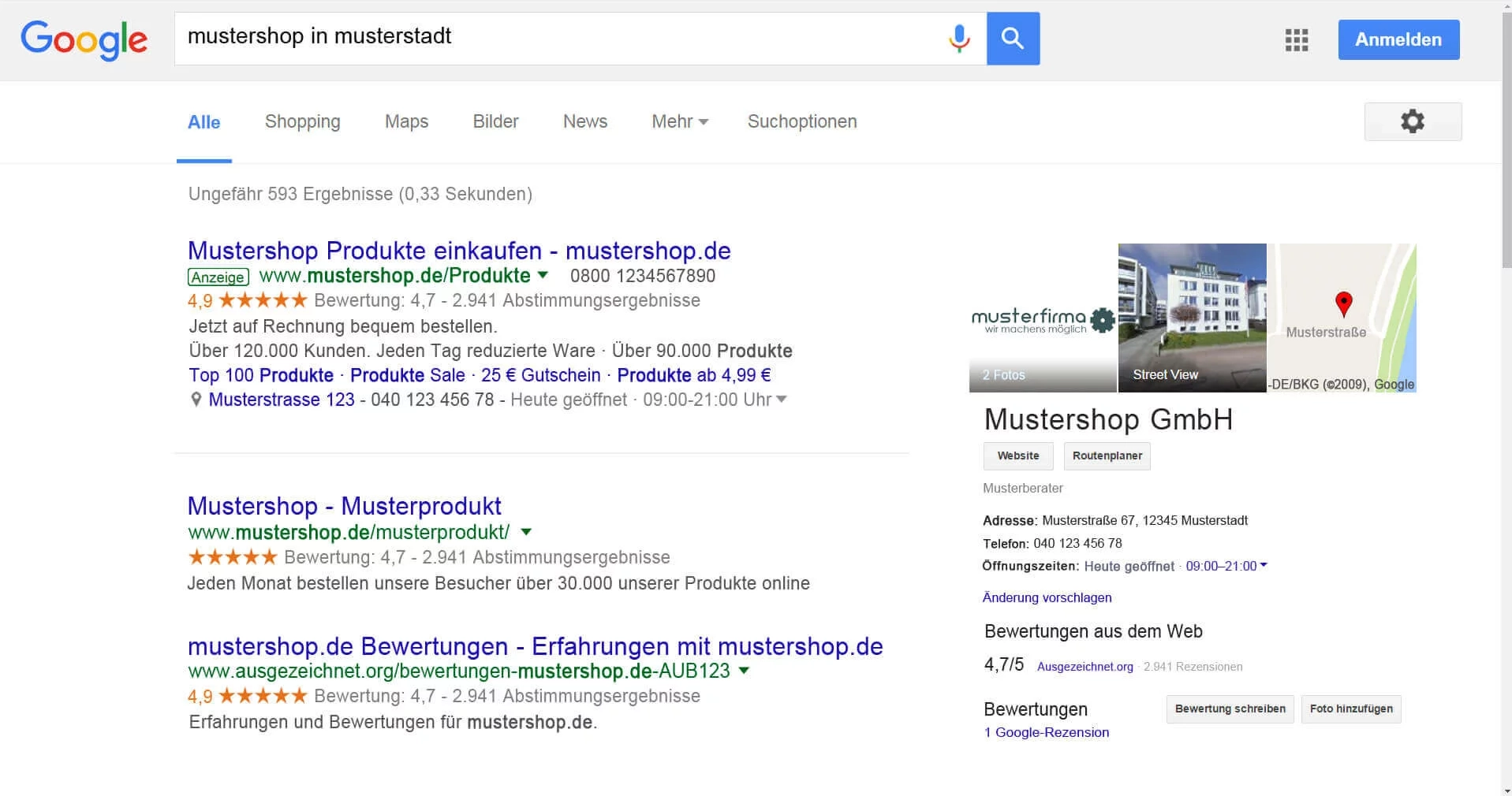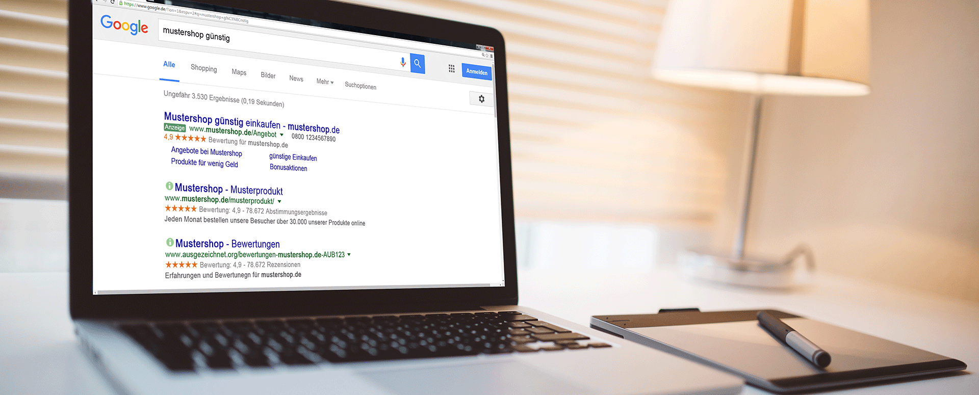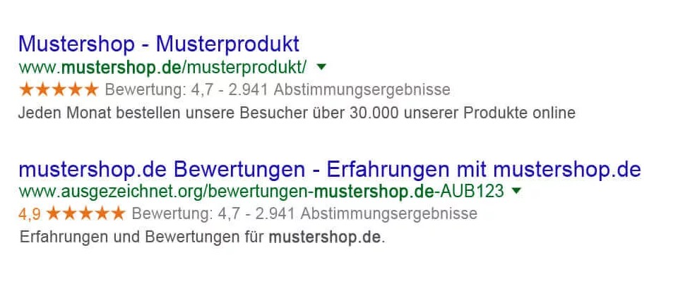 Rich Snippets erweitern ein Google-Suchergebnis um zusätzliche Informationen und stellen damit eine attraktive Möglichkeit dar, die Aufmerksamkeit der Suchenden auf Ihr Angebot zu lenken. Dies können beispielweise Preise, Fotos oder eben Bewertungen Ihrer Kunden sein.