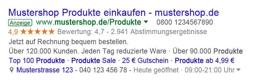 - Verkäuferbewertungen werden in Grün außerdem auch bei Google Shopping angezeigt