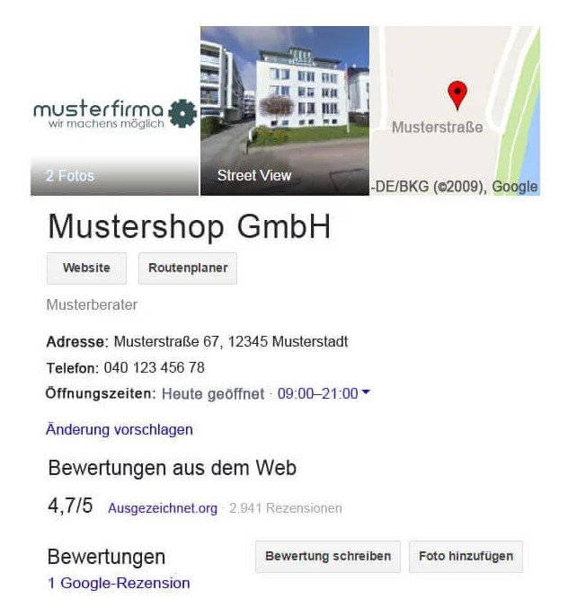 - mit einem MyBusiness-Profil können Bewertungen durch Dritte im Google Snippet “Bewertungen aus dem Web” im Knowlegde Panel rechts neben den Suchergebnissen angezeigt werden