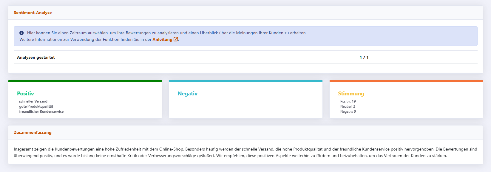In Ihrem Kundenkonto steht Ihnen eine KI-gestützte Sentimentanalyse zur Verfügung. Sie unterstützt Sie dabei, mehrere Bewertungen gleichzeitig auszuwerten und übergeordnete Stimmungen zu erkennen.
