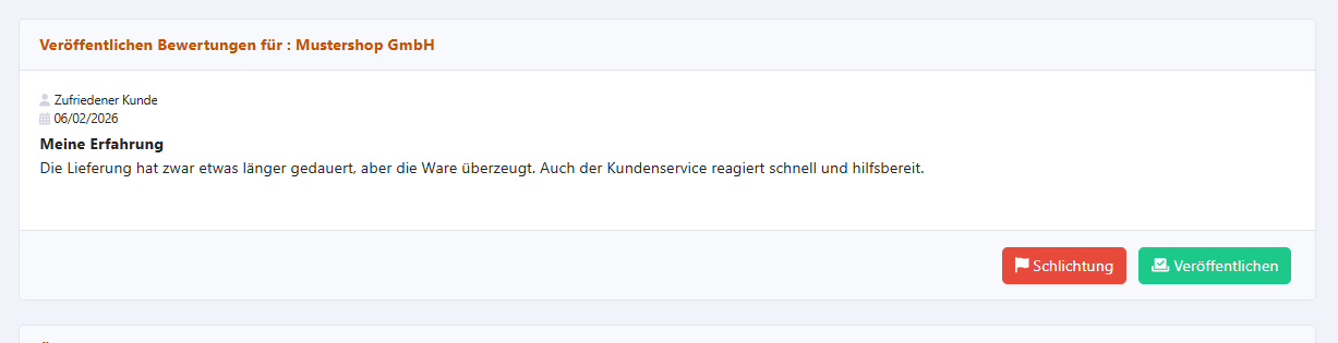 Eingehende Bewertungen werden im Kundenkonto angezeigt und können dort geprüft werden. Sie entscheiden selbst, ob Sie eine Bewertung sofort freischalten oder die automatische Veröffentlichung nach Ablauf der 7-Tage-Frist abwarten.