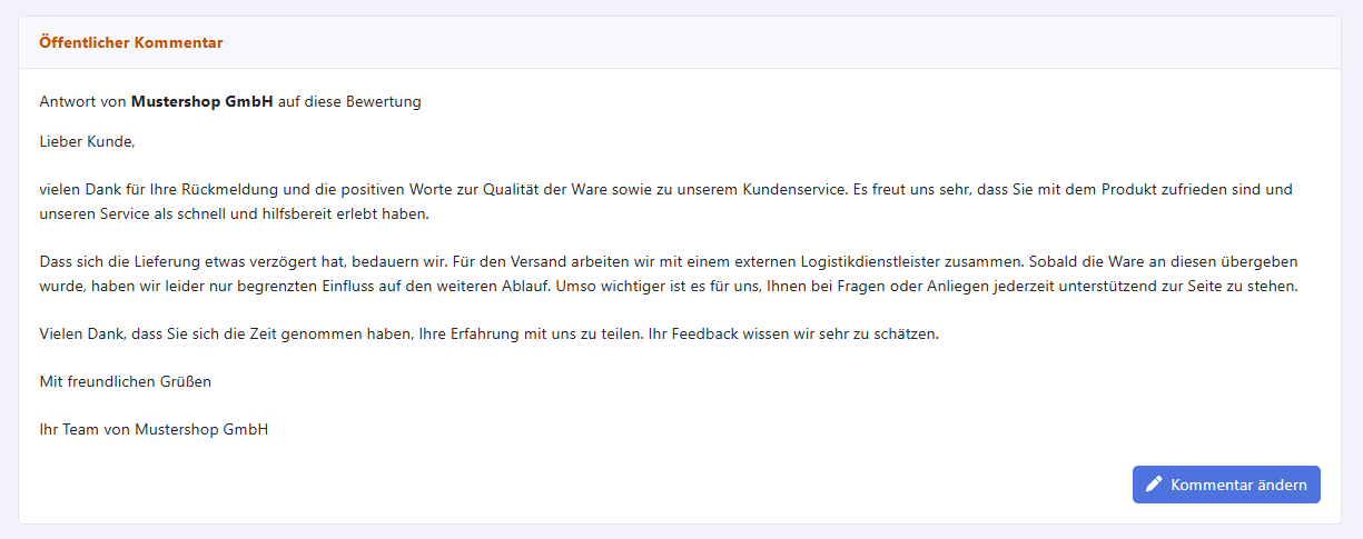 Im Kundenkonto können Sie Ihre Bewertungen direkt kommentieren. Ihre Antwort wird öffentlich unter der jeweiligen Bewertung angezeigt und ist für alle Nutzer sichtbar.