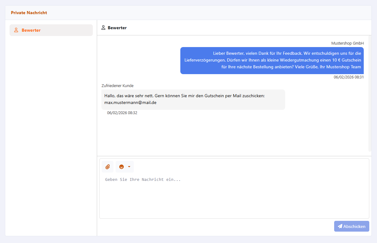 Negative Bewertungen können Sie öffentlich beantworten, um Ihre Sichtweise transparent darzustellen. Alternativ haben Sie die Möglichkeit, über eine Privatnachricht direkt mit dem Bewerter in Kontakt zu treten, um Rückfragen zu klären oder Missverständnisse auszuräumen.
