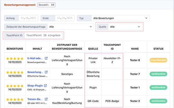 Im Kundenbackend wird die jeweilige Touchpoint ID zu jeder eingegangenen Bewertung angezeigt. So können Sie nachvollziehen, an welchen Stellen im Verkaufsprozess das Sammeln von Bewertungen besonders erfolgreich ist.