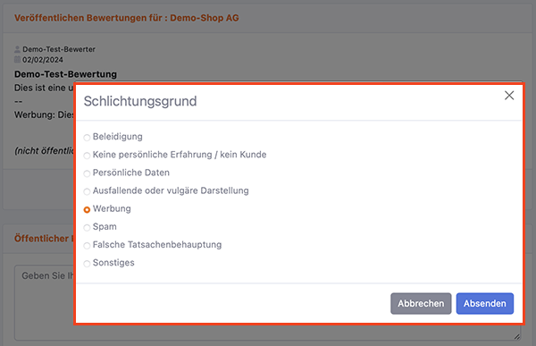 Das moderierte Schlichtungsverfahren ist in den Paketen BUSINESS, PROFESSIONAL und ENTERPRISE enthalten. Kunden mit dem Paket LIGHT können jederzeit die Funktion „Private Nachricht“ oder den öffentlichen Kommentar nutzen, um mit Bewertern in Kontakt zu treten.