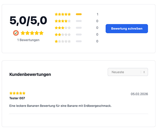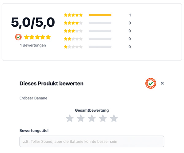 Das Widget wird eingeblendet, sobald ein Kunde auf “Bewertung schreiben” klickt – z.B. im Widget für die Bewertungs-Anzeige.