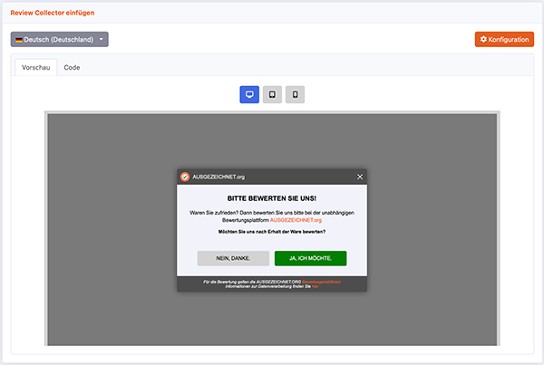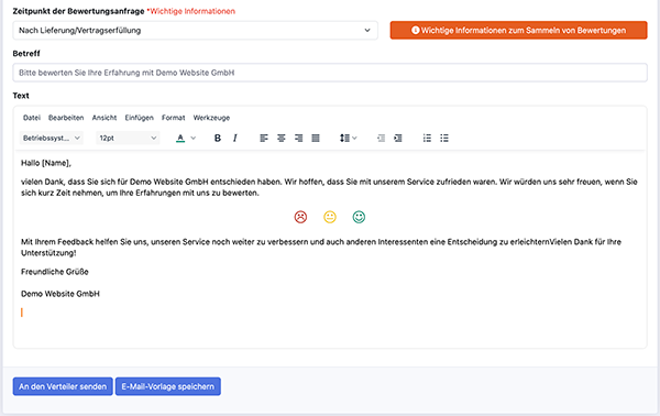 Mit dem Tool namens Review Collector versenden Sie automatisch nach vorausgewählter Anzahl von Tagen eine E-mail mit der Bitte um eine Bewertung.