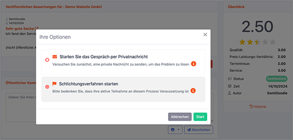 Unser bewährtes Schlichtungsverfahren vermittelt zwischen unseren Kunden und den bewertenden Personen.