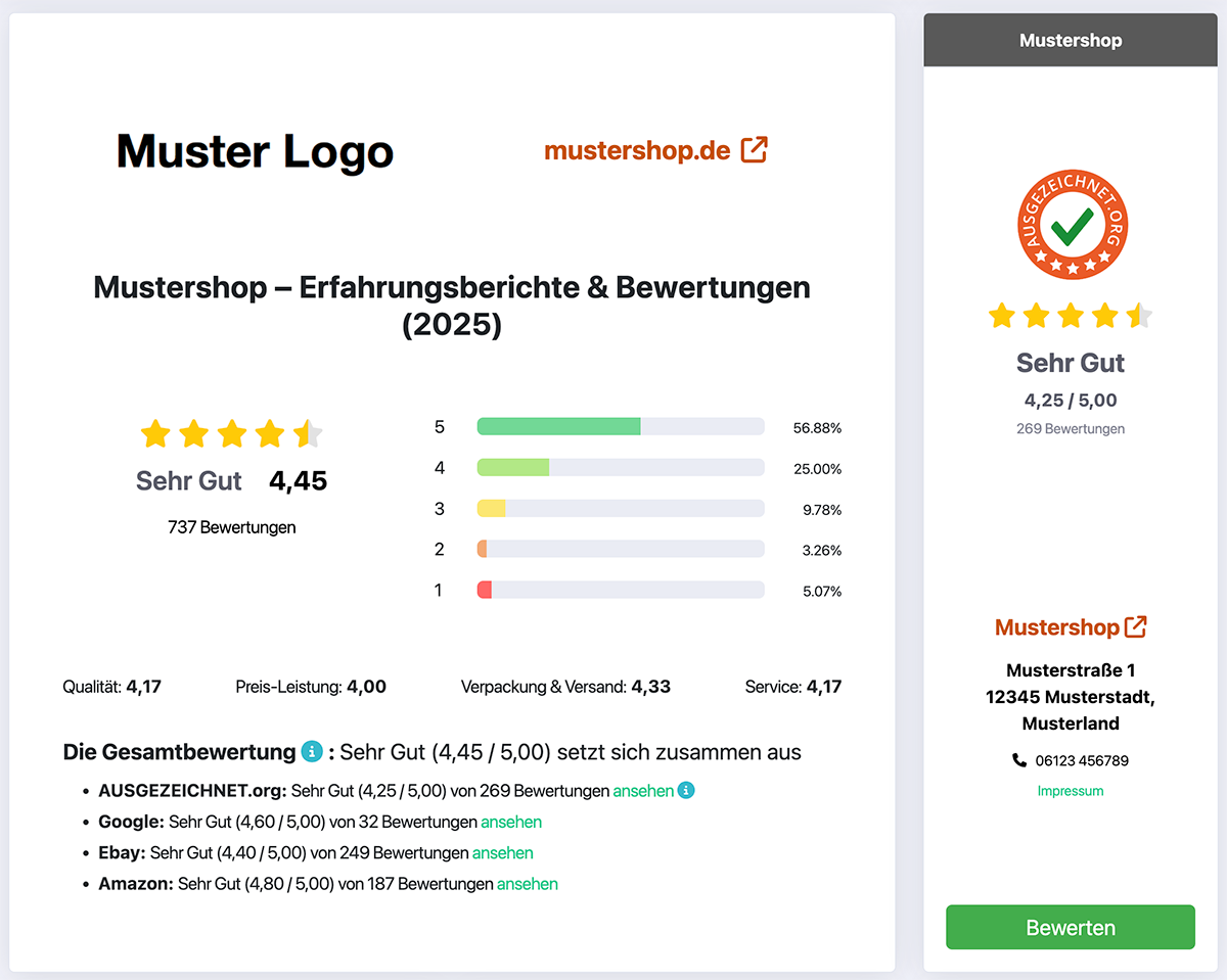 Nach dem Urteil zum „All-in-One“-Siegel (LG Köln, 2017) hat AUSGEZEICHNET.org die Darstellung der Bewertungen angepasst. Heute werden alle Quellen, aus denen Bewertungen stammen, transparent und einzeln ausgewiesen. So können Nutzer und Nutzerinnen jederzeit nachvollziehen, ob eine Bewertung aus dem eigenen Onlineshop, einem Marktplatz oder einer anderen Plattform stammt. Dieses Vorgehen stellt sicher, dass die Herkunft der Bewertungen klar erkennbar ist und keine irreführenden Gesamtdarstellungen entstehen.