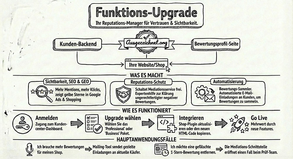Mit dem neuen Self-Service „Features hinzufügen“ machen Sie Ihr AUSGEZEICHNET.org-Setup so flexibel wie Ihr Business: Konfigurieren Sie Ihr Leistungspaket jederzeit selbst, buchen Sie genau die Funktionen, die Sie wirklich brauchen (z. B. Produktbewertungen), und skalieren Sie bei Bedarf einzelne Leistungen einfach nach oben – mit voller Transparenz über Umfang, Zeitpunkt und Kosten. So wächst Ihre Bewertungsstrategie in wenigen Klicks mit und stärkt Ihre Online-Reputation genau dort, wo es zählt.