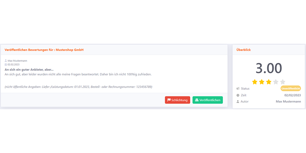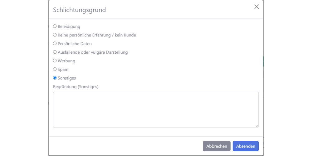 Schlichtungsverfahren: Wenn sich der Konflikt nicht auf direktem Weg klären lässt, können Sie unser moderiertes Schlichtungsverfahren nutzen. Wir empfehlen jedoch, nicht jede negative Bewertung sofort einzureichen – viele Bewerter empfinden das als Eskalation. Der direkte Kontakt ist in den meisten Fällen der bessere erste Schritt.