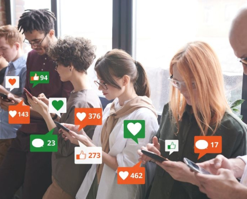 Ausgezeichnet.org erklärt virales Marketing und zeigt auf, wie es dazu kommen kann, das Bild zeigt eine Gruppe von Menschen am Smartphone, aus denen zur Verbildlichung Sprechblasen mit Likes und Kommentare aufsteigen