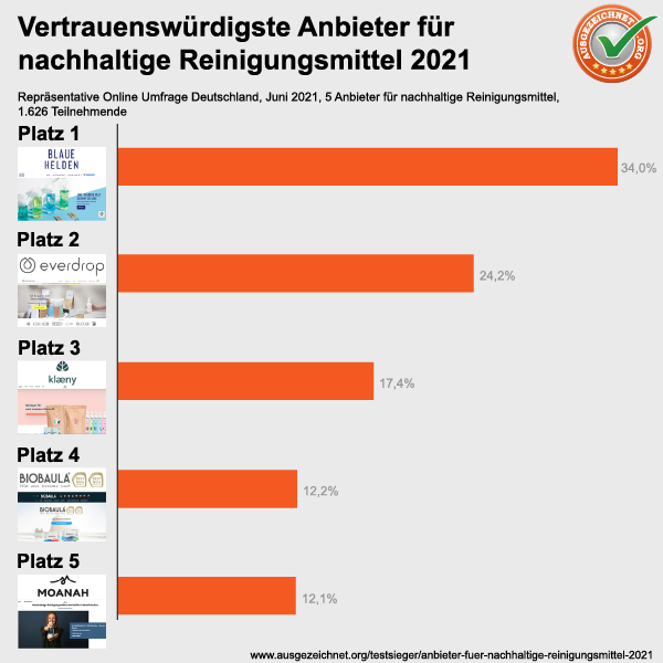 Nachhaltiges und bewusstes Verhalten steht nicht nur im Fokus politischer Debatten, das Thema ist längst in deutschen Haushalten angekommen. Jeder einzelne trägt die Verantwortung für seinen ökologischen Fußabdruck. Nachhaltige Reinigungsmittel sind eine gute Wahl, wenn wir das Grundwasser unserer Heimat nicht zusätzlich mit unnötigen Chemikalien belasten wollen. Doch welchem Anbieter können wir vertrauen? Laien tun sich oftmals schwer, hinter den kryptischen chemischen Formeln die einzelnen Bestandteile und deren Unbedenklichkeit zu erkennen. AUSGEZEICHNET.ORG hat in einer repräsentativen, deutschlandweiten Umfrage für Transparenz gesorgt. 1.626 Teilnehmende wurden zu ihrem Vertrauen in diese fünf Anbieter für nachhaltige Reinigungsmittel befragt: Biobaula, Blaue Helden, Everdrop, klæny und Moanah. Als Testsieger ging Blaue Helden hervor.