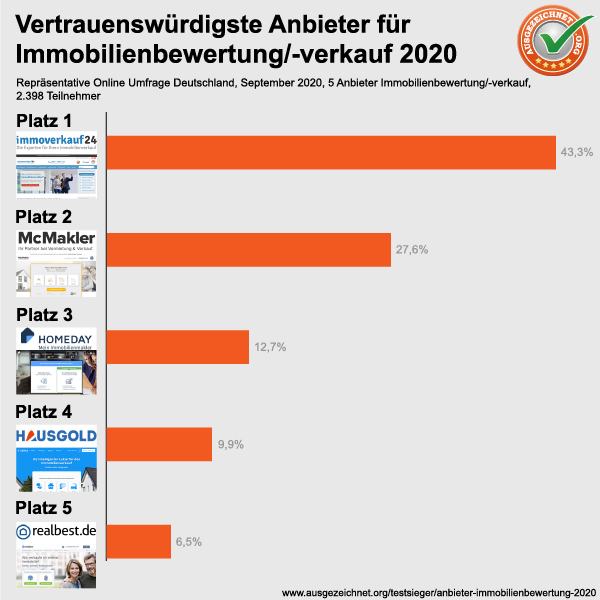 AUSGEZEICHNET.ORG hat 5 Anbieter getestet: Mit Hilfe eines reprĂ€sentativen Online-Panels wurden vom 14. â 19. September 2020 2.398 Personen aus ganz Deutschland befragt, mit der Fragestellung: âWelcher dieser Marken fĂŒr Immobilienbewertung und -verkauf vertrauen Sie am meisten?â