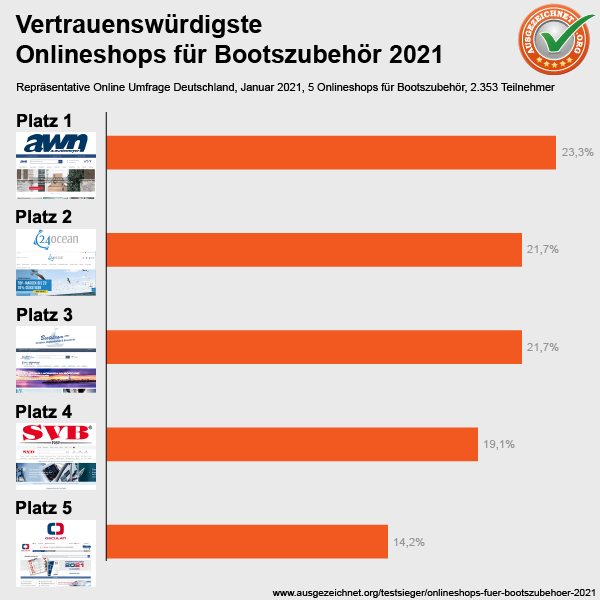 Mit Hilfe eines repräsentativen Online-Panels wurden vom 28. Januar – 03. Februar 2021 2.353 Personen aus ganz Deutschland befragt, mit der Fragestellung: „Welcher dieser Marken von Onlineshops für Bootszubehör vertrauen Sie am meisten?“