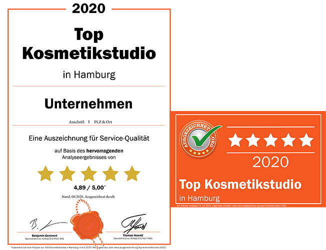 AUSGEZEICHNET.ORG hat Ihr Kosmetikstudio zum „Top Kosmetikstudio 2020 in Hamburg“ gekürt? Herzlichen Glückwunsch! Nehmen Sie Kontakt mit uns auf, damit Sie schnell von den vielen Vorteilen dieser Auszeichnung profitieren können!